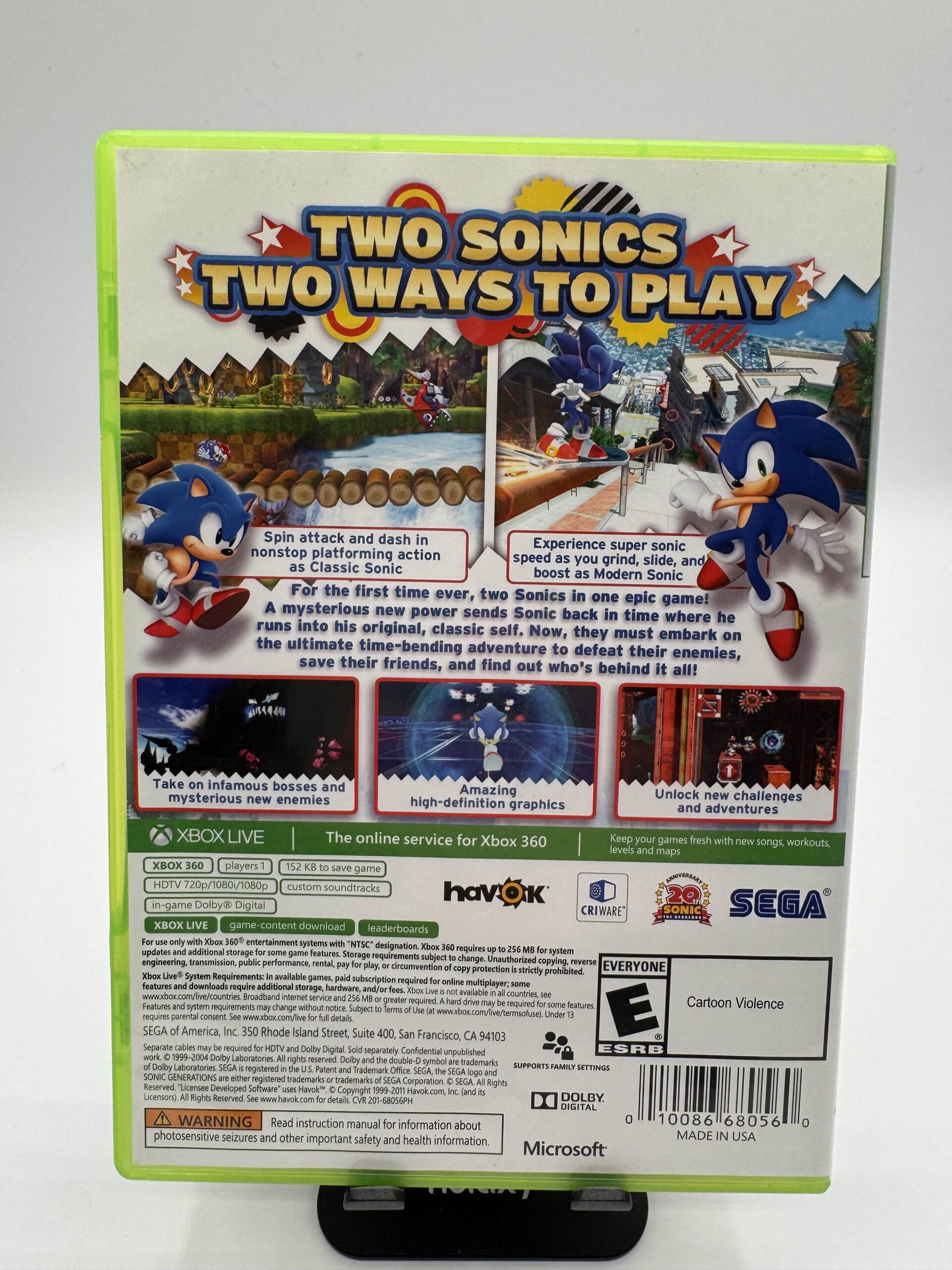 Set across three defining eras from 20 years of Sonic the Hedgehog video game history, the instantly recognizable environments of Sonic Generations have been re-built in stunning HD and are now playable in both classic side scrolling 2D from 1991, as well as modern 3D style found in Sonic’s most recent adventures.